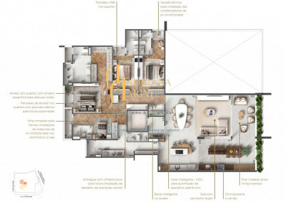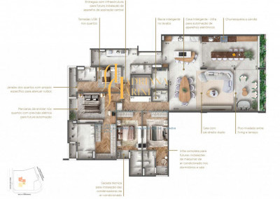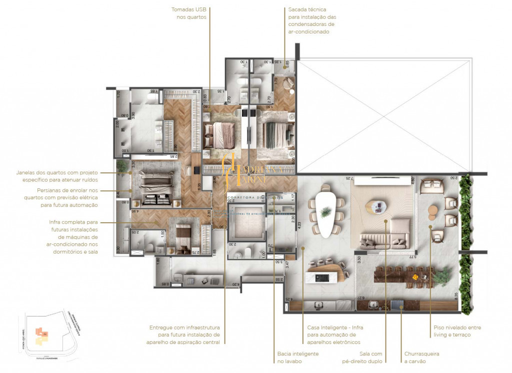 Infraestrutura de ponta: Preparação para ar-condicionado, aspiração central e automatização de persianas e equipamentos eletrônicos;