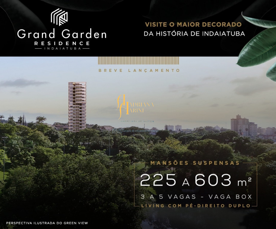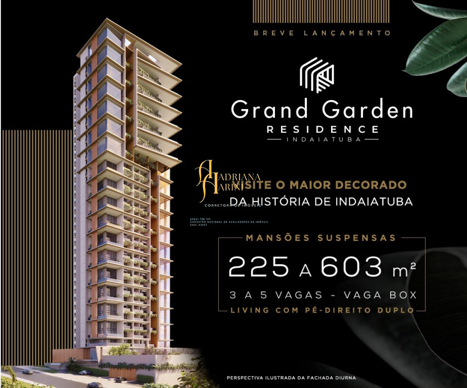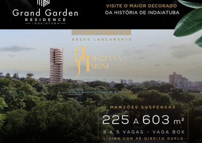 Mansões suspensas, o Gran Garden é um empreendimento que chega em Indaiatuba trazendo um novo conceito para morar. Sofisticação em cada detalhe, com metragens variadas: 225 m² com 3 vagas de garagem; 276 m² com 3 ou 4 vagas de garagem; 280 m² com 4 vagas de garagem; 318 m² com 4 vagas de garagem e as coberturas de 603 m² com 5 vagas de garagem.