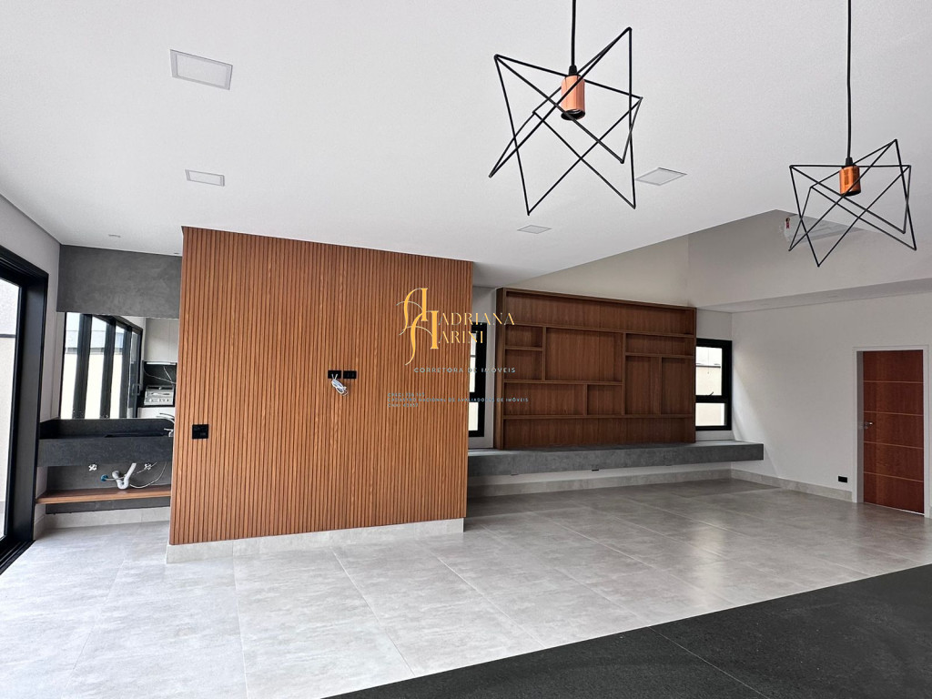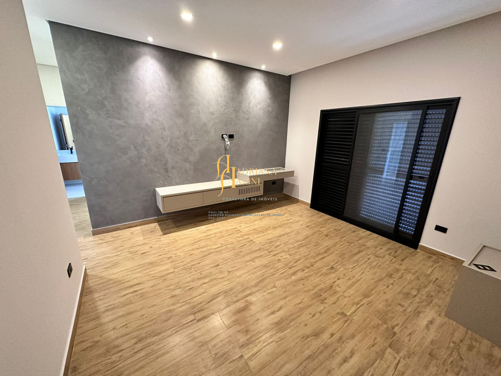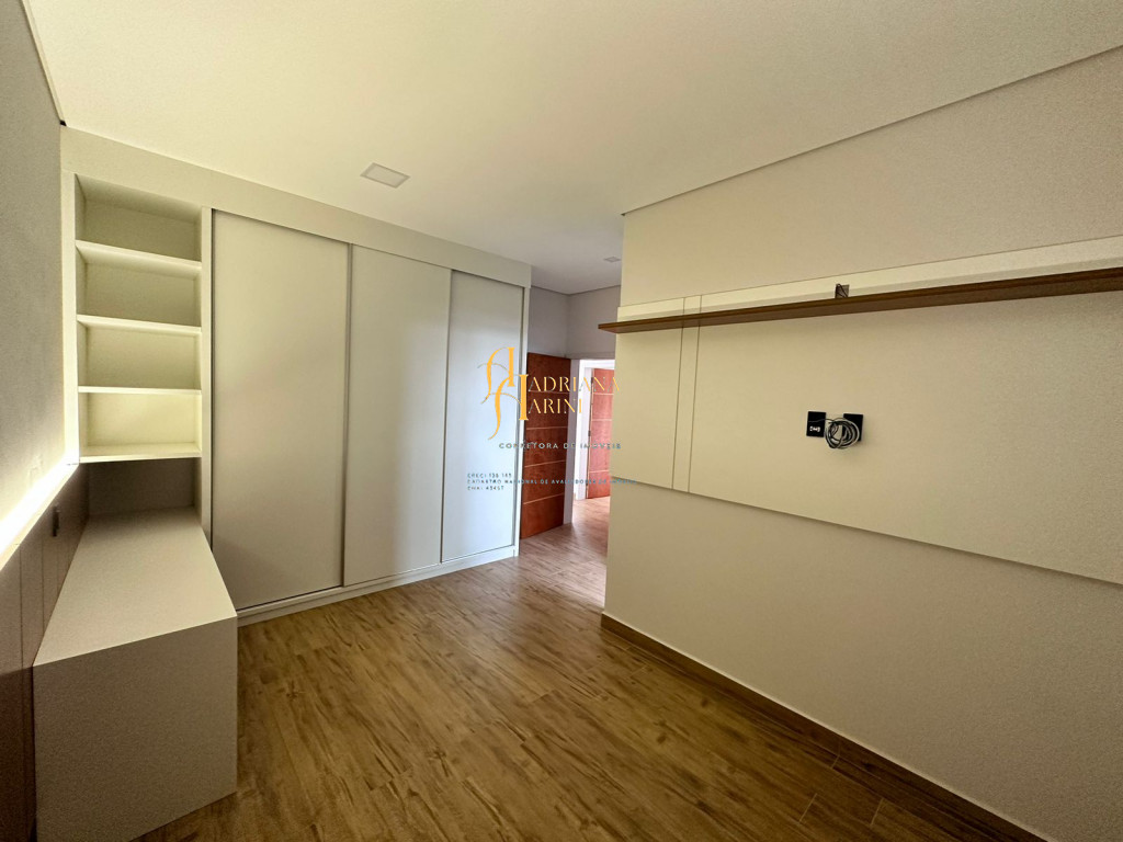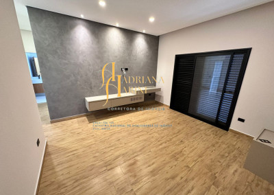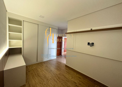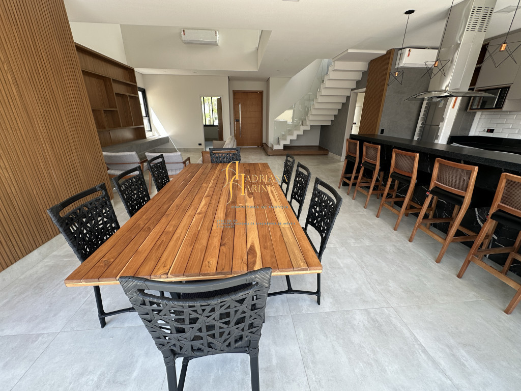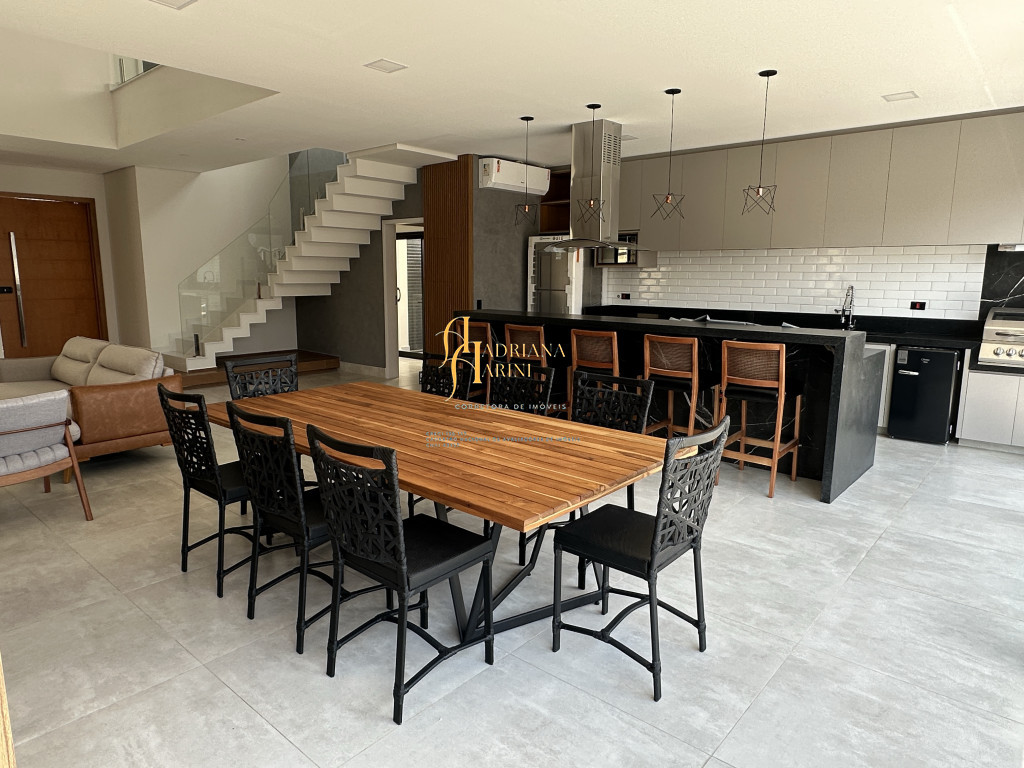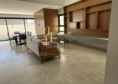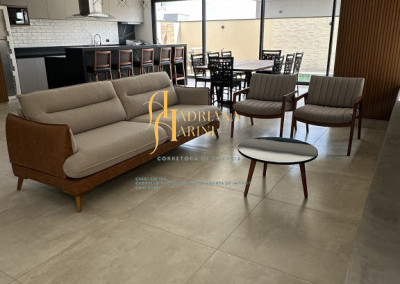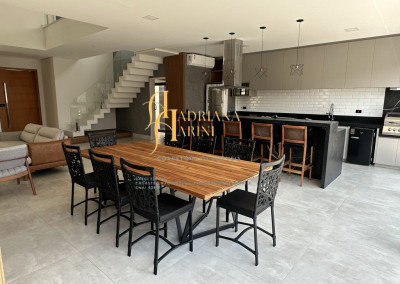 3 quartos (suítes); 1 lavabo; sala de jantar; espaço living; sala de TV; escritório; cozinha gourmet com churrasqueira e móveis embutidos: coock-top 5 bocas, coifa, forno embutido, micro-ondas, geladeira, frigobar, lava louça, máquina de lavar roupas, purificador de água, lavanderia com máquina de lavar. Aquecedor solar – boiler com 400L; iluminação; paisagismo; piscina com cascata; preparação para aquecedor solar. Vaga de garagem para 2 carros cobertos e 2 descobertos.