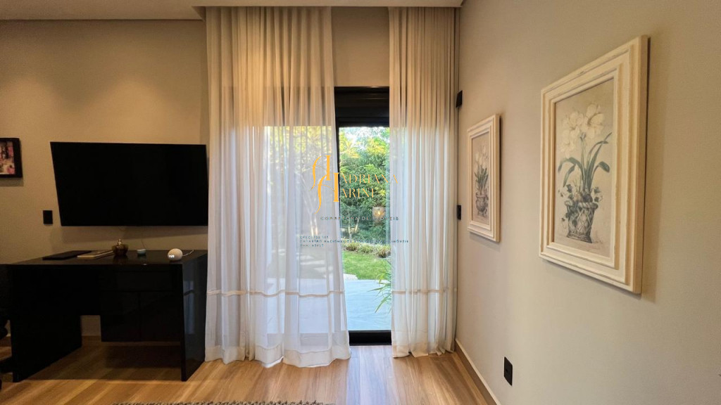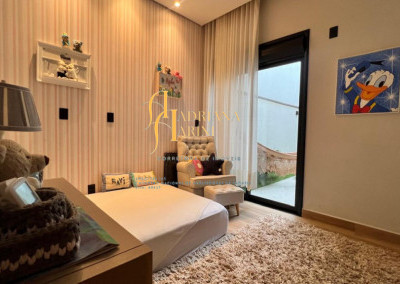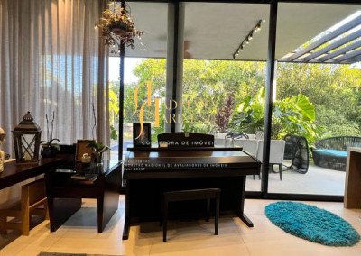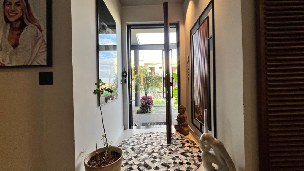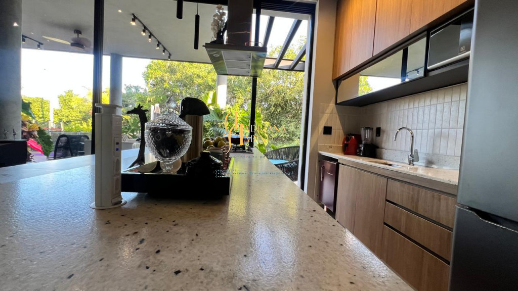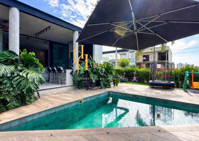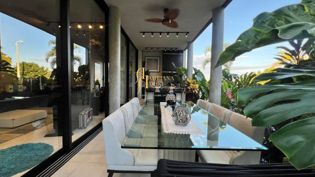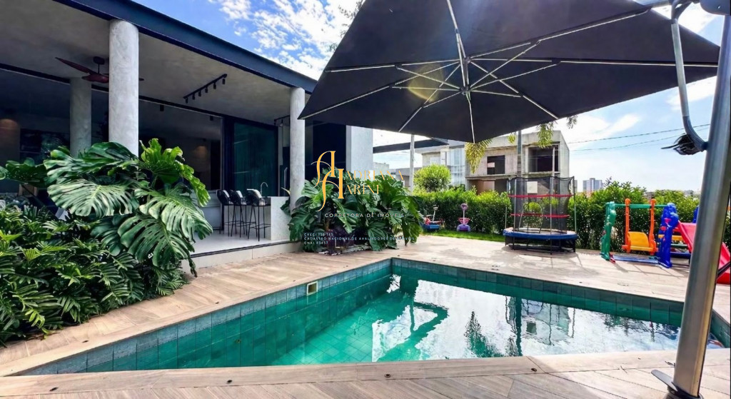 4 suítes sendo 1 com closet (todas as suítes com porta balcão e automatizadas); lavabo; sala 2 ambientes com home; cozinha com ilha, coifa, móveis planejados, cooktop e fogão (sala, cozinha e área gourmet integrados); despensa; quintal co acesso à área verde do condomínio e lago; piscina; lago ornamental em construção; depósito; 2 vagas de garagem coberta e 2 descobertas.