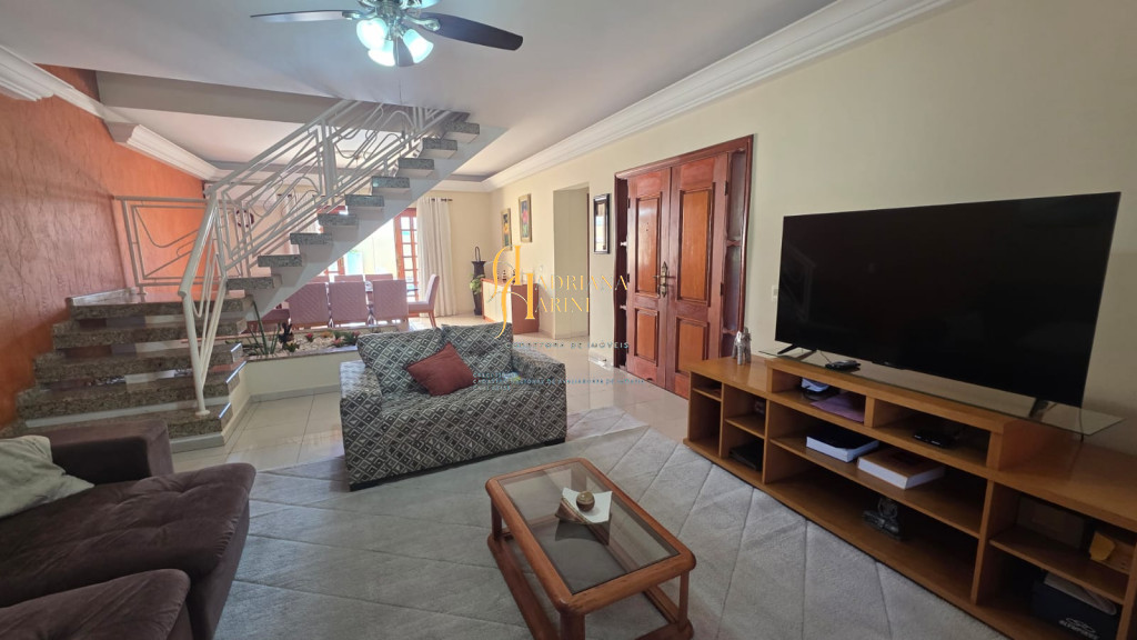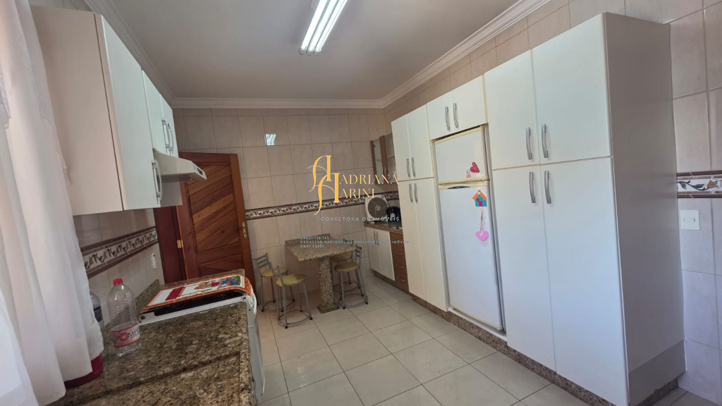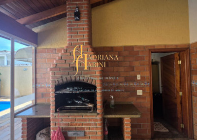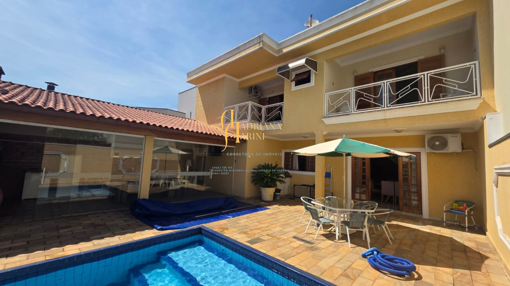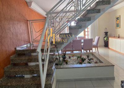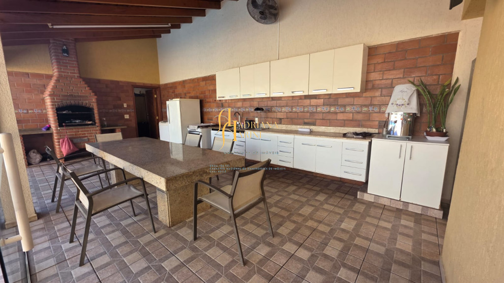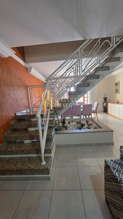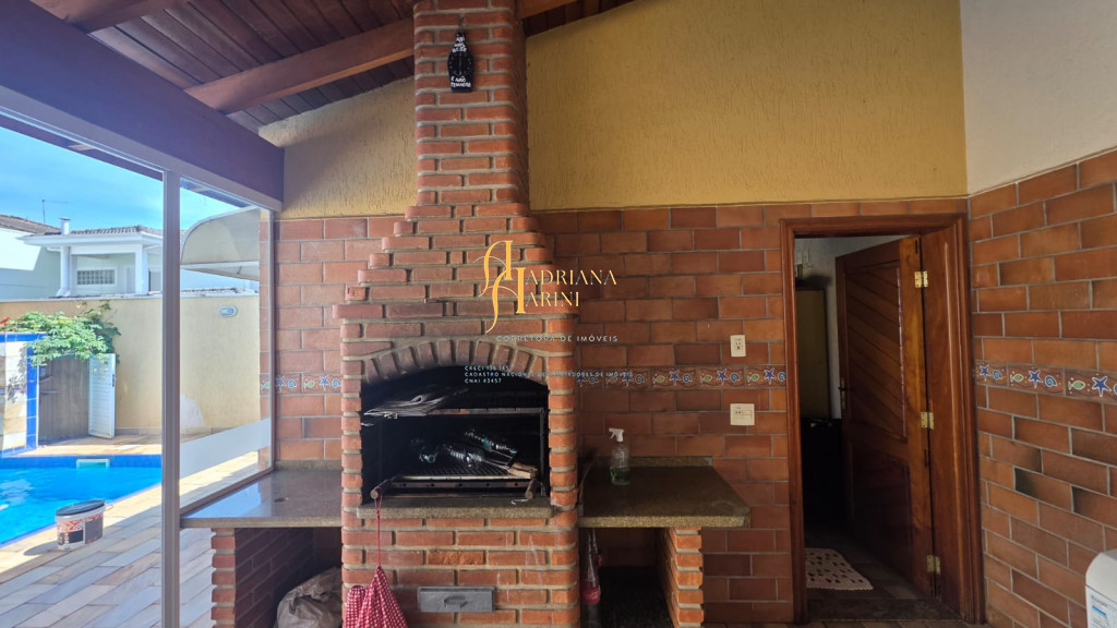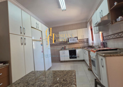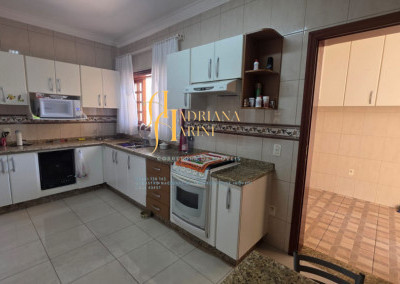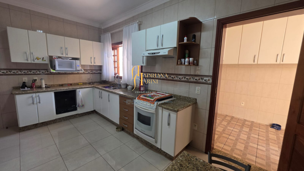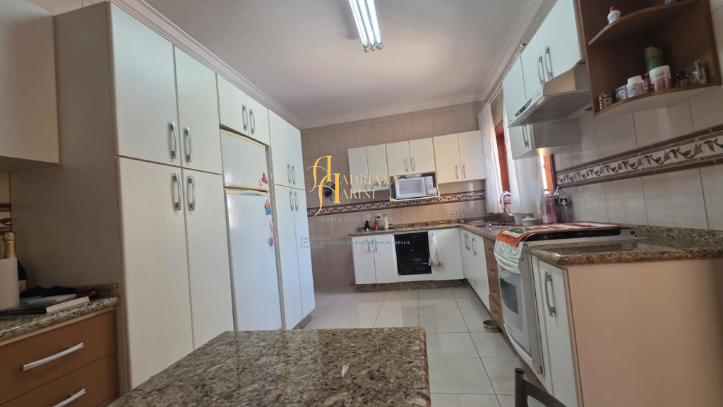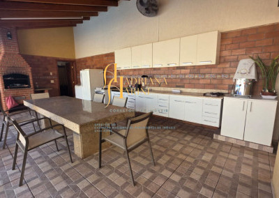4 suítes sendo 1 com closet e ar condicionado; lavabo; sala de jantar; sala de TV; jardim de inverno; cozinha com móveis planejados, fogão e forno; lavanderia com armários; área gourmet com armários, toda fechada com vidros, churrasqueira; forno de pizza; 1 suíte para visitas ou ajudantes; vaga para 2 carros cobertos e 2 descobertos.