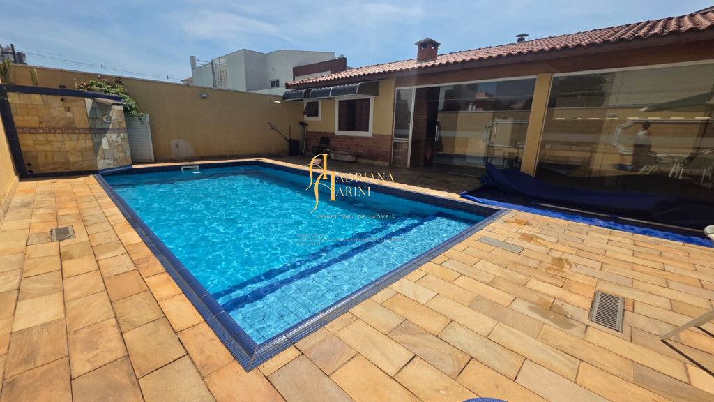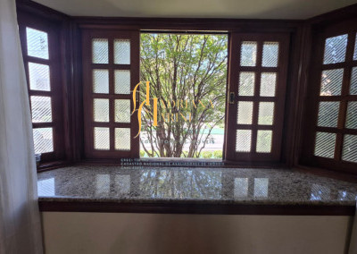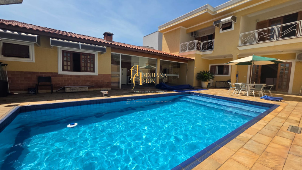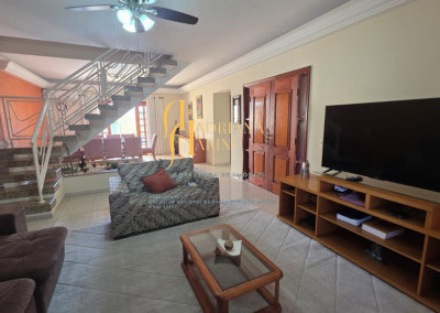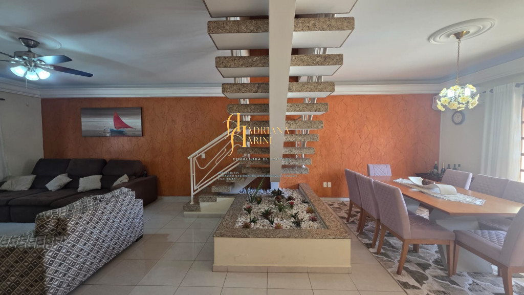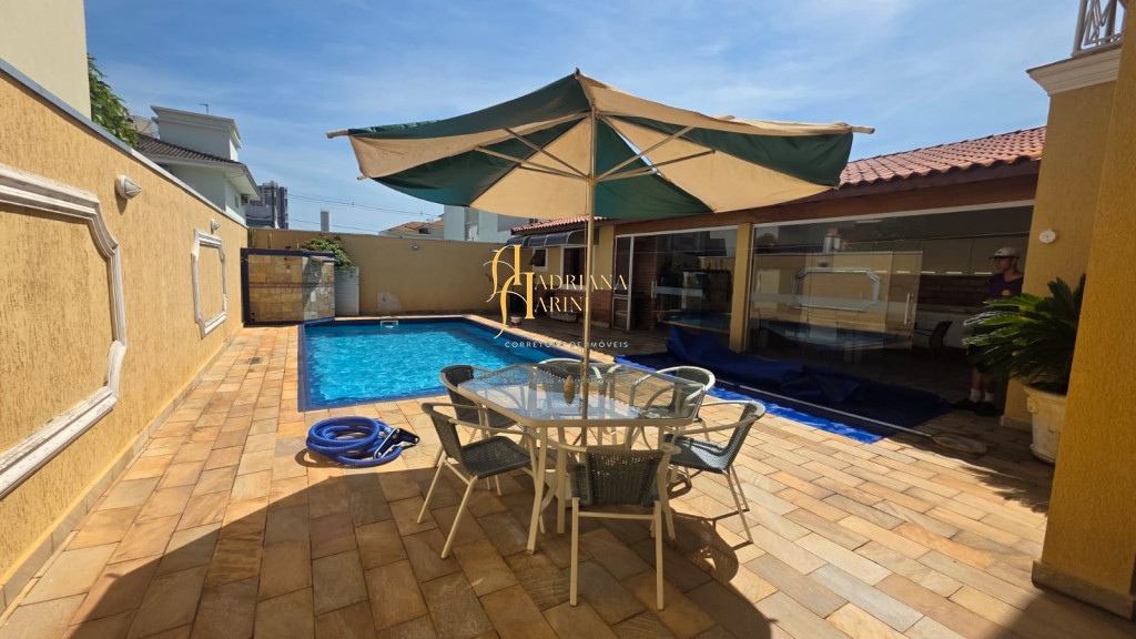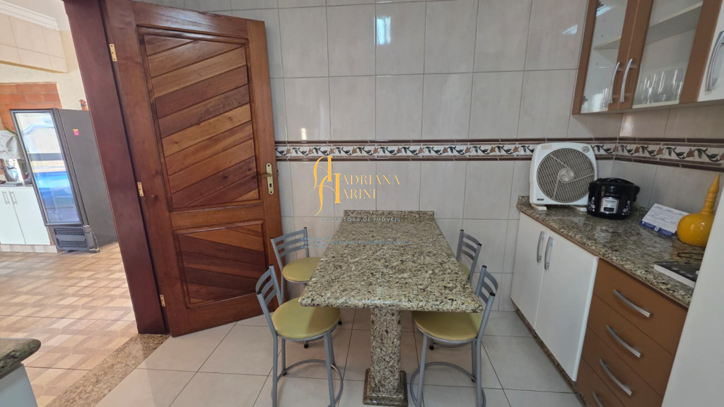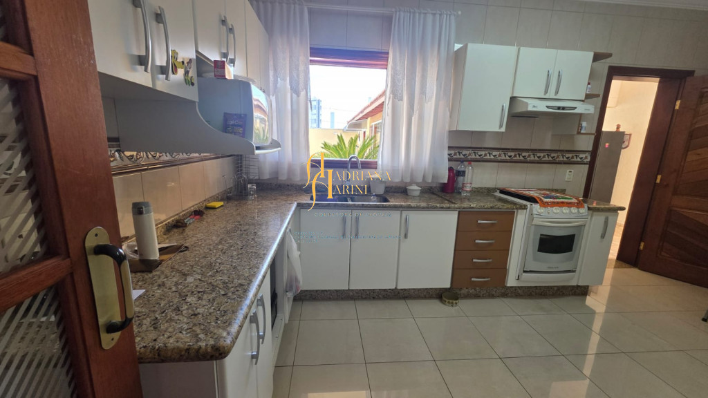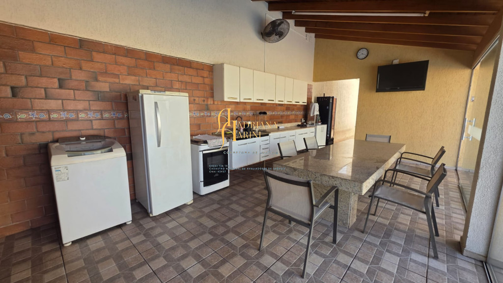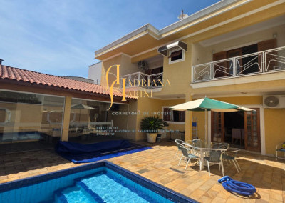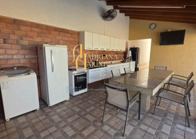 4 suítes sendo 1 com closet e ar condicionado; lavabo; sala de jantar; sala de TV; jardim de inverno; cozinha com móveis planejados, fogão e forno; lavanderia com armários; área gourmet com armários, toda fechada com vidros, churrasqueira; forno de pizza; 1 suíte para visitas ou ajudantes; vaga para 2 carros cobertos e 2 descobertos.